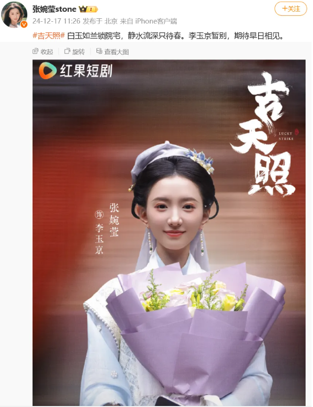 12月17日,张婉莹晒剧照宣布新剧杀青。