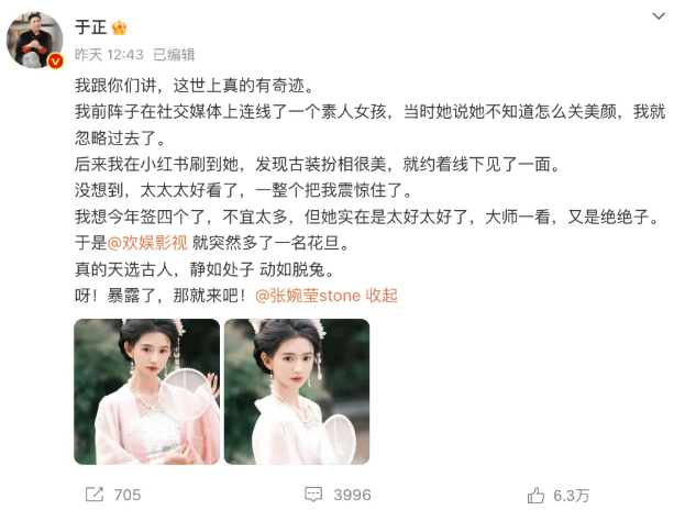 2024年12月,于正晒照官宣新签约素人美女张婉莹,大赞对方外貌“真的天选古人,静如处子动如脱兔”。随即有网友发现该女生曾是一名河南某高校教师。
